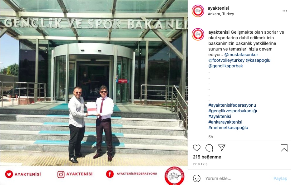 Ayak Tenisi Federasyonu yönetimi, Instagram hesabında, ayak tenisinin gelişmekte olan sporlar ve okul sporlarına dahil edilmesi için Bakanlık ile görüşmeler yaptıklarını duyurmuş.