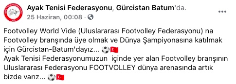Ayak Tenisi Federasyonu, Facebook sayfasında, Footvolley World Vide (Uluslararası Footvolley Federasyonu)na Footvolley branşında üye olmak ve Dünya Şampiyonasına katılmak için Gürcistan-Batum’da olduklarını duyurmuş.