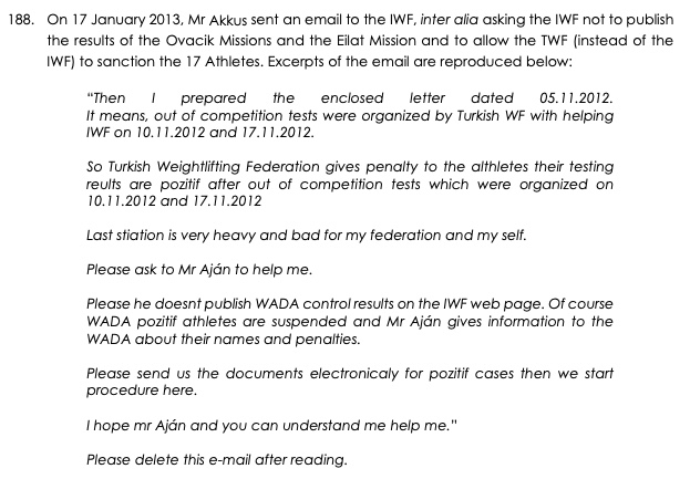 Akkuş, e-postasında IWF başkanı Tamás Aján‘ın ve IWF‘nin kendisine yardım etmesi için âdeta yalvarmış.
