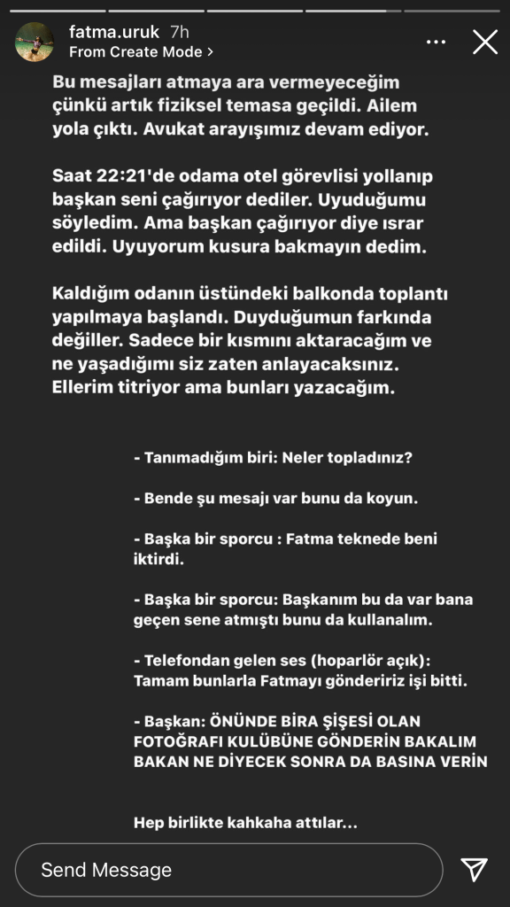 “Milli takım kampımda, psikolojik şiddet ve federasyon tarafından ayrımcılığa maruz kalmaktayım. Bu olayları daha önce yaşadığım için kampa gelmeme talebimi daha önce kendilerine iletmiştim fakat kabul edilmedi. Şimdi de buradan ayrılmama izin verilmiyor.