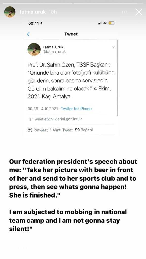Uruk, bir tweetinin ekran görüntüsünü kullanarak uluslararası camiaya seslendi. İngilizce kaleme aldığı Instagram mesajında milli takım kampında mobbinge uğradığını; sessiz kalmayacağını duyurdu.
