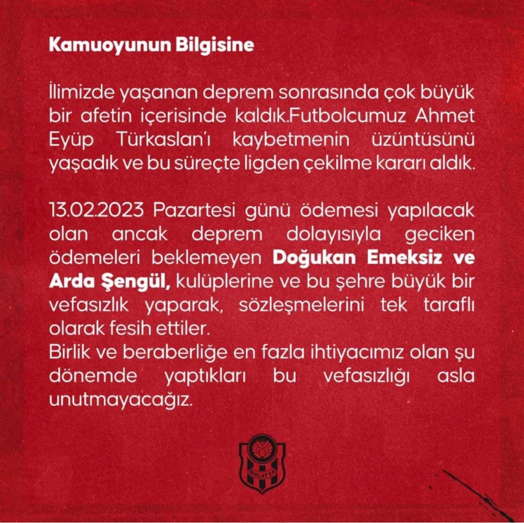 Yeni Malatyaspor yönetimi, kulübün Instagram hesabında bir açıklama yayınladı.