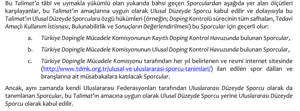 TDMK “Kayıtlı Doping Kontrol Havuzunda”bulunan Sporcular ile belirli spor dallarında 16 yaş ve üzeri; TDMK tarafından belirlenen kategorilerdeki Ulusal Şampiyonalara katılan Sporcular, Milli takım kadrosunda bulunan veya kamplarına katılan sporcular, Türkiye Olimpiyat Hazırlık Merkezlerine kayıtlı sporcuların Ulusal Düzeyde Sporcu olarak kabul edileceğini” düzenliyor.
